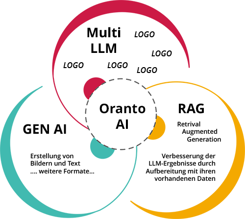 Oranto AI vereint die Stärken generativer KI (Gen AI) aus verschiedenen großen Sprachmodellen (LLM) mit der Retrieval Augmented Generation (RAG), um KI-Lösungen anzubieten, die sowohl datenschutzkonform als auch individuell anpassbar sind, während sie gleichzeitig eine maximale Kontrolle über organisationssinterne Daten gewährleisten.